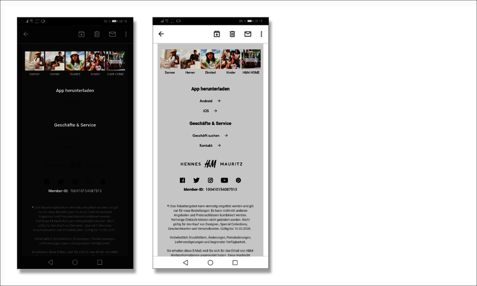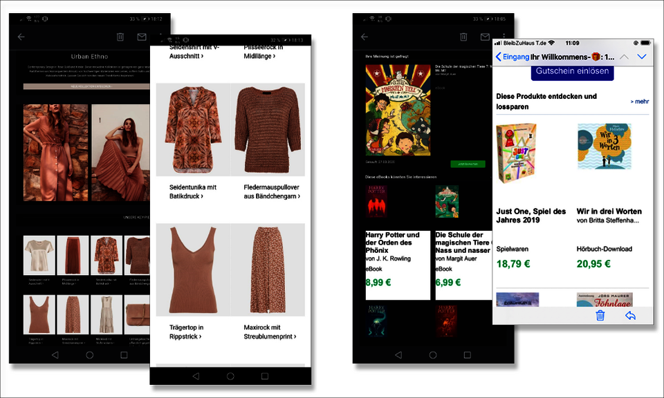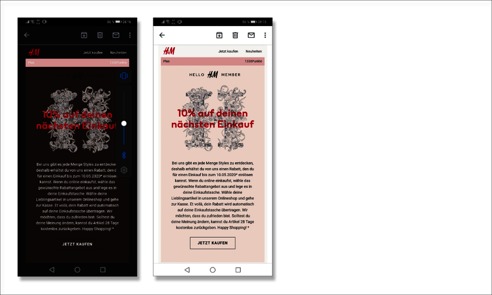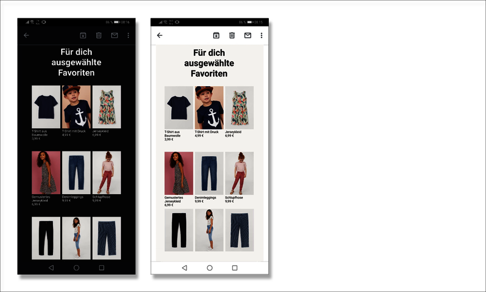 Seit 2017 interpretieren Android Smartphones häufig nicht mehr die mobile Version des Mailings. Das gilt insbesondere unter der bei Auslieferung vorinstallierten gmail App. Statt der mobilen Variante – in der zum Beispiel der Text unter das Bild rutscht – stellen sie eine verkleinerte und deswegen schlecht lesbare Webversion dar.