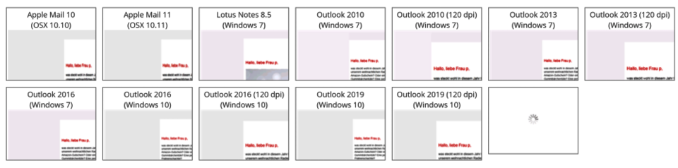 Mit dem Litmus-Darstellungstest wird ihr Mailing an mehr als 50 Endgeräte geschickt. Automatisch werden Screenshots aus den verschiedenen Posteingängen zurückgegeben. Eine gute Methode, um eine sichere Darstellung zu testen. Auch wenn nicht wirklich alle Schwierigkeiten, die durch Bildschirme verursacht werden, abgedeckt sind, bietet das Tool doch einen sehr guten Überblick. Leider ist es kostenpflichtig. Es ist aber bereits standardmäßig in vielen guten Mailing-Softwares integriert.