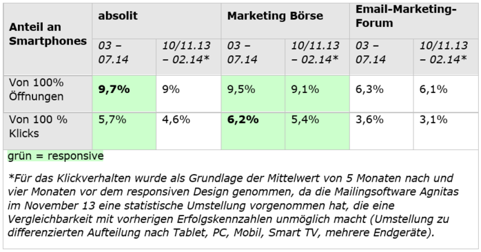 In den 5 Monaten nach der responsiven Optimierung des absolit-Templates stieg der Anteil an mobilen Lesern (Öffnungen) von 9% (Okt. 2013-Feb. 2014) auf 9,7% (März – Juli 2014). Bei der bereits mobil optimierten Marketing Börse stieg der Anteil an mobilen Lesern im gleichen Zeitraum von 9,1% auf 9,5%, um 0,4%. Der mobile Anteil an Öffnungen des nicht mobil optimierten EMMF-Newsletters stieg lediglich um 0,2% von 6,1% auf 6,3%.