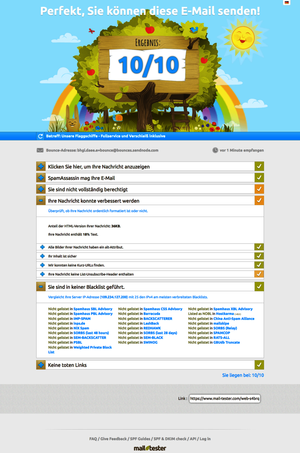 Sind Sie sich weiterhin unsicher oder hören Sie immer wieder, dass der Newsletter trotz aller getroffenen Maßnahmen im Spam landet, probieren Sie doch einmal den sehr aufschlussreichen kostenlosen Spam-Check mailtester. Klickt man auf die URL, erhält man ein virtuelles Postfach, an das man das fragliche Mailing schickt. Das sofort vorliegende Ergebnis zeigt eine Aufschlüsselung wichtiger Komponenten des Mailings, die auf seine (fehlende) Qualität hinweisen können. So z.B. Nutzung von Alternativtext bei Bildern, Vorhandensein als gefährlich eingestufter Elemente wie JavaScript, iFrames, embeded Content oder Applets oder ob der Newsletter aus Versehen "tote" Links enthält.